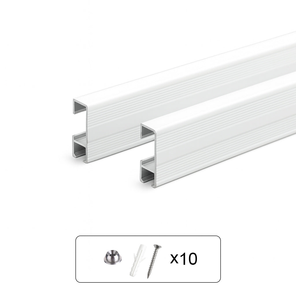 Each set includes two rails, ten mounting clips, and ten plastic wall anchors with screws for secure, reliable installation.